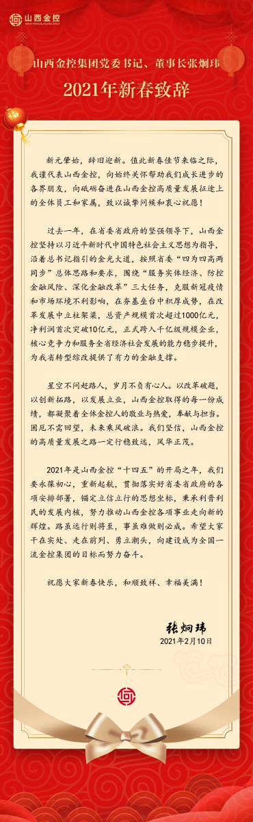 山西金控集团党委书记、董事长张炯玮2021年新春致辞