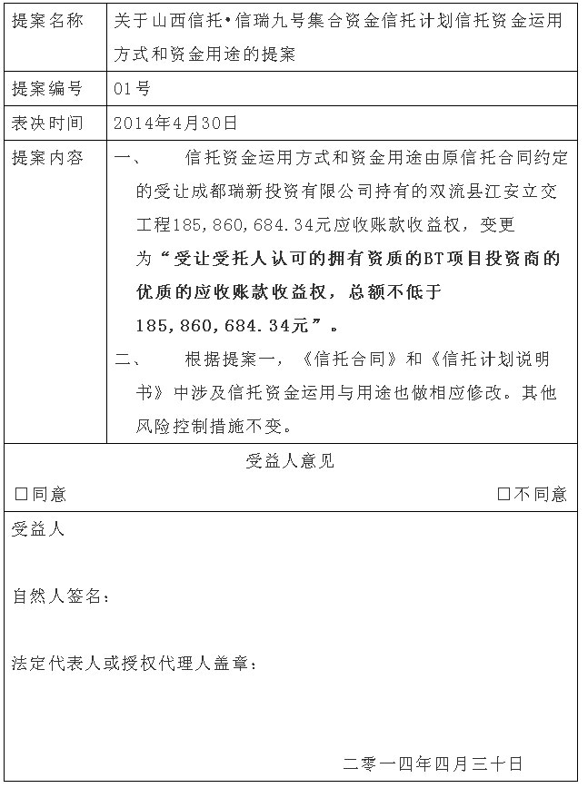 3、会议事由:由于成都瑞新投资有限公司回收江安立交工程款进度好于预期,截止2014年4月25日,共回收70,979,850元,相应地本计划募集的信托资金受让的185,860,684.34元应收账款收益权中70,979,850元应收账款收益权灭失。为了保持本信托计划的正常运行,保证受益人的信托利益,现决定增加受托人认可的拥有资质的BT项目投资商的优质的应收账款收益权,使本计划持有的应收账款收益权总额不低于185,860,684.34元。
