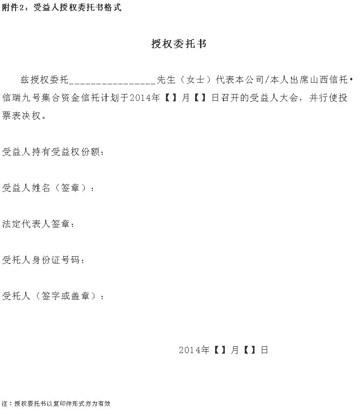 根据山西信托•信瑞九号集合资金信托计划(以下简称“本计划”)受益人大会召集事项的约定,山西信托股份有限公司拟召开本计划受益人大会,现将具体事项通知如下: